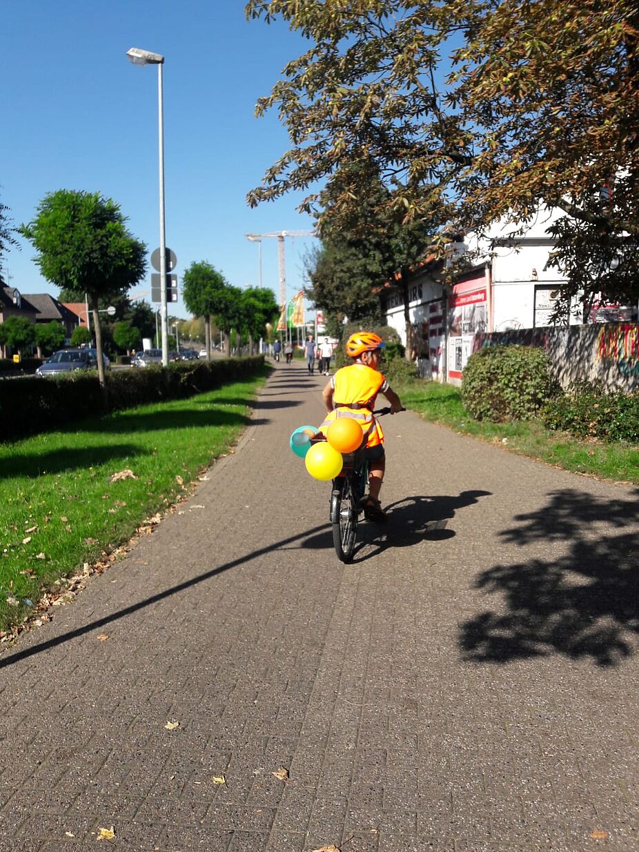 Schließlich setzt sich ein Demonstrationszug aus ca. 700 Menschen auf Rädern in Bewegung, darunter ca. 330 Kinder. Vornweg fährt die Polizei als Freund und Helfer. Der Zug wird von zehn Kindern angeführt, die schon verkehrssicher sind. Sie sorgen für ein kindgerechtes Tempo. Es geht durch die Gartenstraße, die Meinardusstraße, die Auguststraße, die Alexanderstraße über den Pferdemarkt zurück zum Schloßplatz. Wenn man als Ordner*in die Aufgabe übernommen hat, an einer Kreuzung die Radfahrenden vor Autos zu sichern, kann man den nicht enden wollenden, fröhlich klingelnden, bunten Zug genießen. Die Radelnden haben an diesem Ausnahmetag viel Platz, nämlich eine ganze Fahrbahnbreite. Sie können sich sicher fühlen, nebeneinander fahren und miteinander sprechen. Es ist rundherum familien- und kindgerecht – sogar für die Kleinsten und die Ältesten. Radfahren macht Spaß!