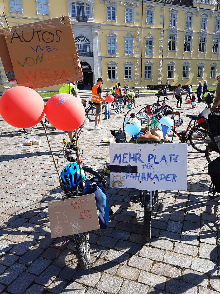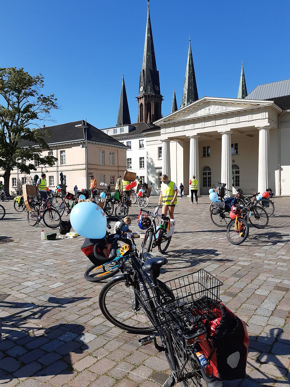 Der Oldenburger Schloßplatz ist gesprenkelt mit weißen Kreuzen im Abstand von zwei Metern. Nach und nach präsentiert sich aus allen Richtungen die Vielfalt der Oldenburger Radler*innen, darunter viele Kinder. Man sieht die Kleinsten mit Laufrädern oder in ihren Kindersitzen, Eltern mit oder ohne Transportrad für die Jüngsten sowie Großeltern mit schnittigen E-Bikes. Fahrräder sind mit bunten Luftballons geschmückt. Die Menschen versammeln sich Corona gerecht mit Abstand und Maske. Handgemalte Pappschilder zeigen die Forderungen unserer jüngsten Mitbürger*innen an die Politik und die Erwachsenen auf: „Verkehrswende statt Weltende“, „für mehr sichere Schulwege“, „Autos weg von unseren Wegen“, und „mehr Platz für Fahrräder“.