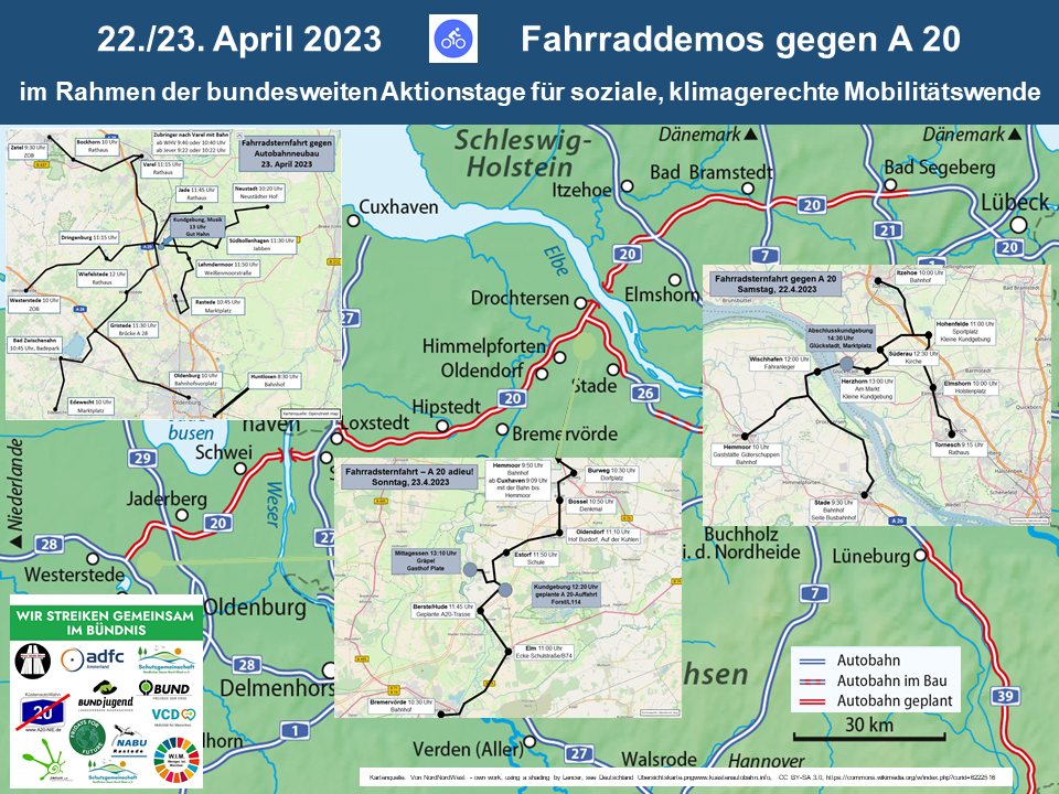 Die Fahrrad-Sternfahrt ist Teil von deutschlandweiten Aktionstagen für eine soziale und ökologische Mobilitätswende. Allein entlang der geplanten Strecke der A 20 sind zwei weitere Fahrrad-Demonstrationen geplant. „Gerade der Beschluss der Regierungskoalition an diesem Montag zeigt, wie wichtig es ist, gegen die ideologische Verkehrspolitik der Bundesregierung Flagge zu zeigen“, sagt Lasse Maslonka von Moor bleibt Moor. „Wer im Ausbau von Autobahnen ein überragendes öffentliches Interesse sieht, ignoriert die Klimakrise und wälzt deren Bewältigung und Folgen auf die kommenden Generationen ab.“