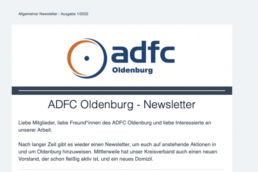 In regelmäßigen Abständen informieren wir Interessierte per E-Mail über Aktionen und Aktivitäten in unserem Kreisverband. Jetzt unseren Newsletter abonnieren.